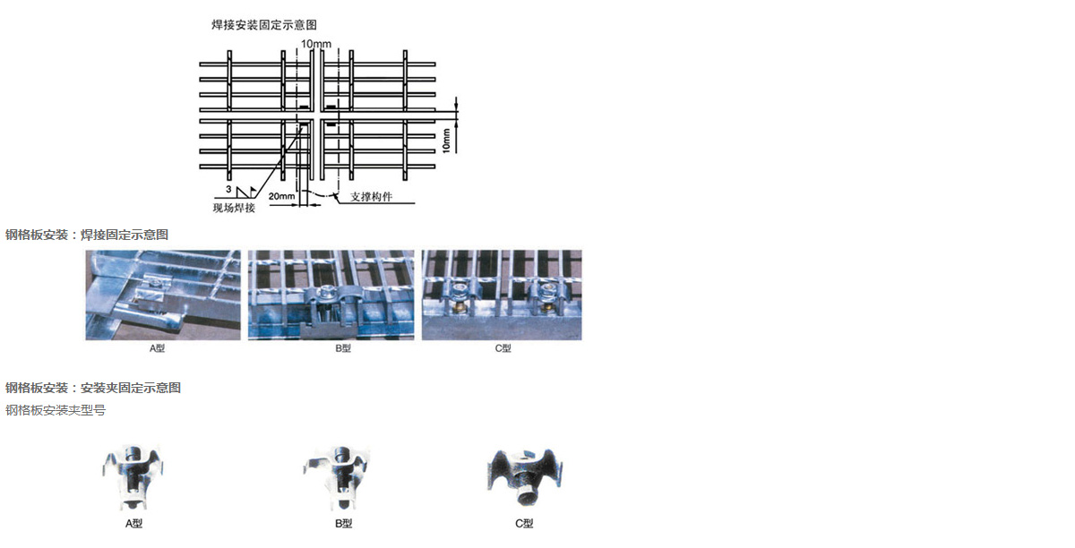 (2)鋼格板的安裝方法:焊接和安裝夾固定兩種方法。